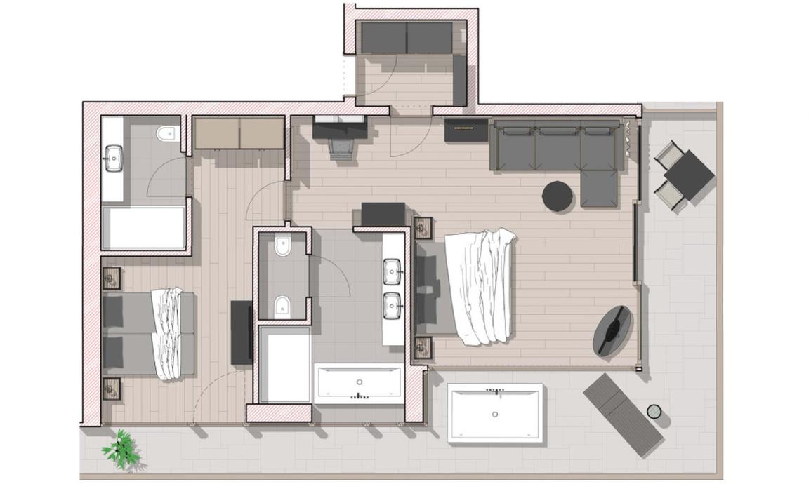 Wooden flooring. Comfortable double bed (2.10 m) with spectacular views of the alpine scenery. Relaxation corner with „The Flame“ fireplace. 55-inch flat screen. Free WiFi. Safe. Mini-bar and assortment of wines. Cremesso coffee machine. Roof terrace with scenic bathtub and gorgeous views. Luxury bathroom with two-person shower and bath. Hair dryer and make-up mirror. Separate toilet and bidet. Second bedroom with double bed, flat screen TV and en-suite bathroom. Wellness bag with bathrobes, bath towels and slippers. Underground parking included.