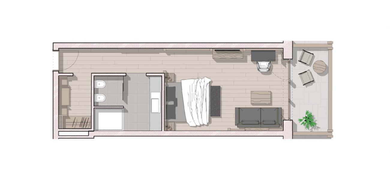 Wooden flooring. Comfortable double bed (2.10 m) and wonderful view of the Dolomites. Walk-in closet. Sofa. 49-inch flat screen. Free WiFi. Mini-bar. Cremesso coffee machine. Balcony with view of the Dolomites. Bathroom with shower. Hair dryer and make-up mirror. Separate toilet and bidet. Wellness bag with bathrobes, bath towels and slippers. Underground parking included.