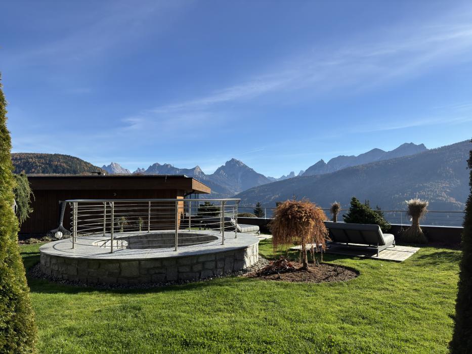 Pavimento in legno. Comodo letto matrimoniale di 2,10 m. Divano. Schermo piatto da 42 pollici. Free WiFi. Cassaforte. Minibar. Macchinetta per il caffè Cremesso. Terrazza e giardino con lettini relax e vista sulle Dolomiti. Bagno con doccia emozionale. WC. Bidet. Asciugacapelli e specchio da trucco. Borsa wellness con accappatoi, teli da bagno e ciabattine. Incluso parcheggio sotterraneo.