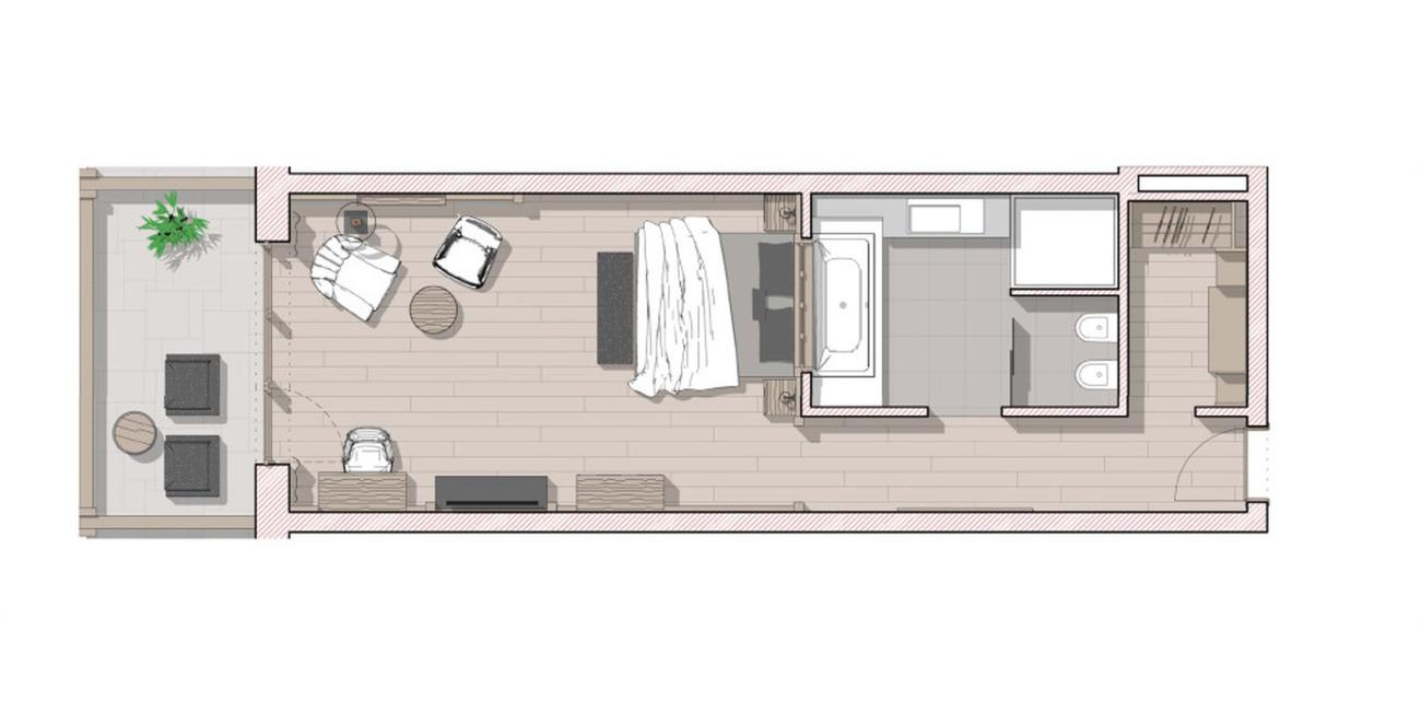Pavimento in legno. Comodo letto matrimoniale di 2,10 m con vista diretta sulla natura. Cabina armadio. Poltrona. Caminetto “The Flame”. Schermo piatto da 47 pollici. Free WiFi. Cassaforte. Minibar. Macchinetta per il caffè Cremesso. Balcone o terrazza con vista panoramica sul Plan de Corones. Bagno con vasca e doccia emozionale. Asciugacapelli e specchio da trucco. WC e bidet separati. Borsa wellness con accappatoi, teli da bagno e ciabattine. Incluso parcheggio sotterraneo.